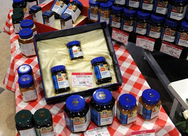 青岛某商场里经过多次包装的蜂蜜(2月20日摄)。时下,市场上琳琅满目的各色商品,从烟酒、茶叶、高档食品,到最普通的元宵、鸡蛋、水果蔬菜等,外包装一个比一个漂亮,绸缎衬里、描金绘彩,炫人眼目。这些花哨包装不仅华而不实,还造成资源浪费和环境污染。