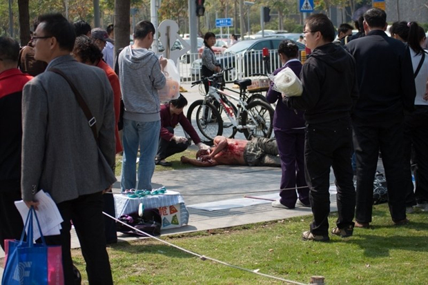 光头男子裸露上半身躺地,腹部可见刀伤。