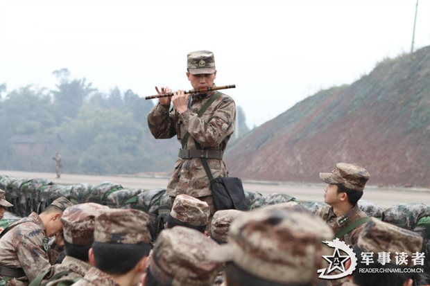 拉练间隙,战士龙小冬为大家吹奏笛子