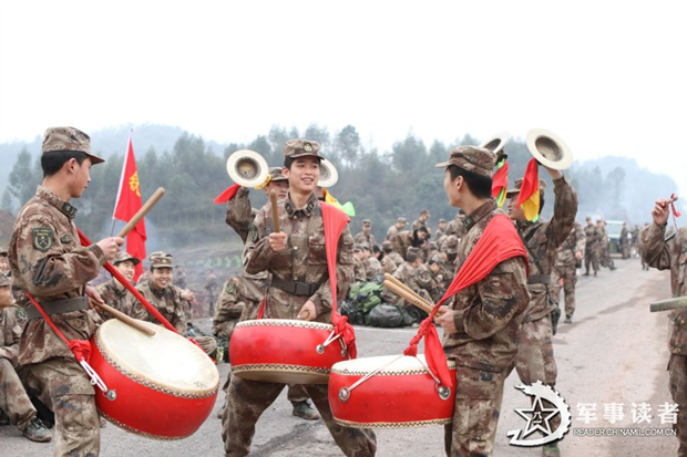 文艺骨干利用拉练间隙表演威风锣鼓,鼓舞士气,振奋精神。