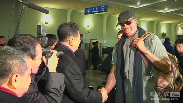 图为2月26日,美国NBA退役球员罗德曼抵达平壤顺安机场。