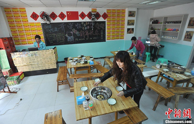 2月21日,重庆一家“80后的课堂”创意火锅店,店员正在整理餐桌准备迎客。