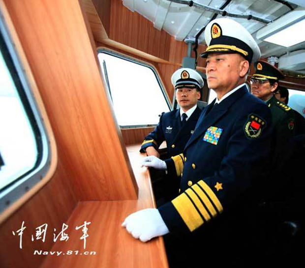 2月25日下午,海军司令员吴胜利视察海军新型护卫舰首舰582舰。