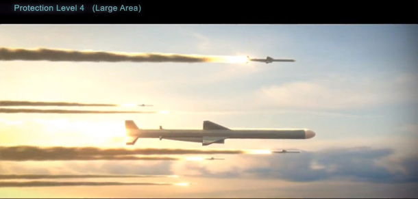 假想舰队遭疑似中国C-802反舰导弹饱和攻击。