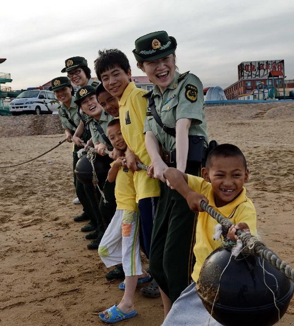 这是秦皇岛市西河南边防派出所女子巡逻队的民警带着北京光爱学校的孩子在南戴河海滨玩耍