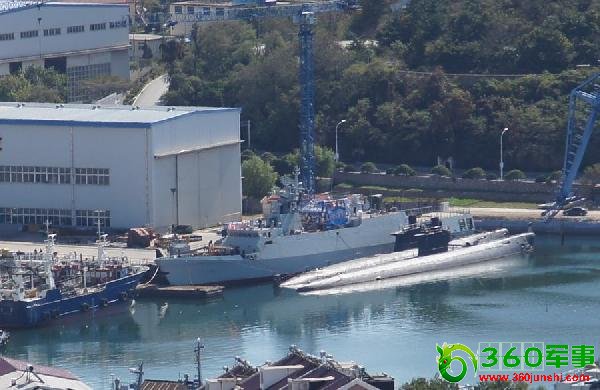 10月初,网友拍摄到的停靠在辽宁省某造船厂内的同型号国产新型护卫舰,它旁边还停靠着两艘200型潜艇。